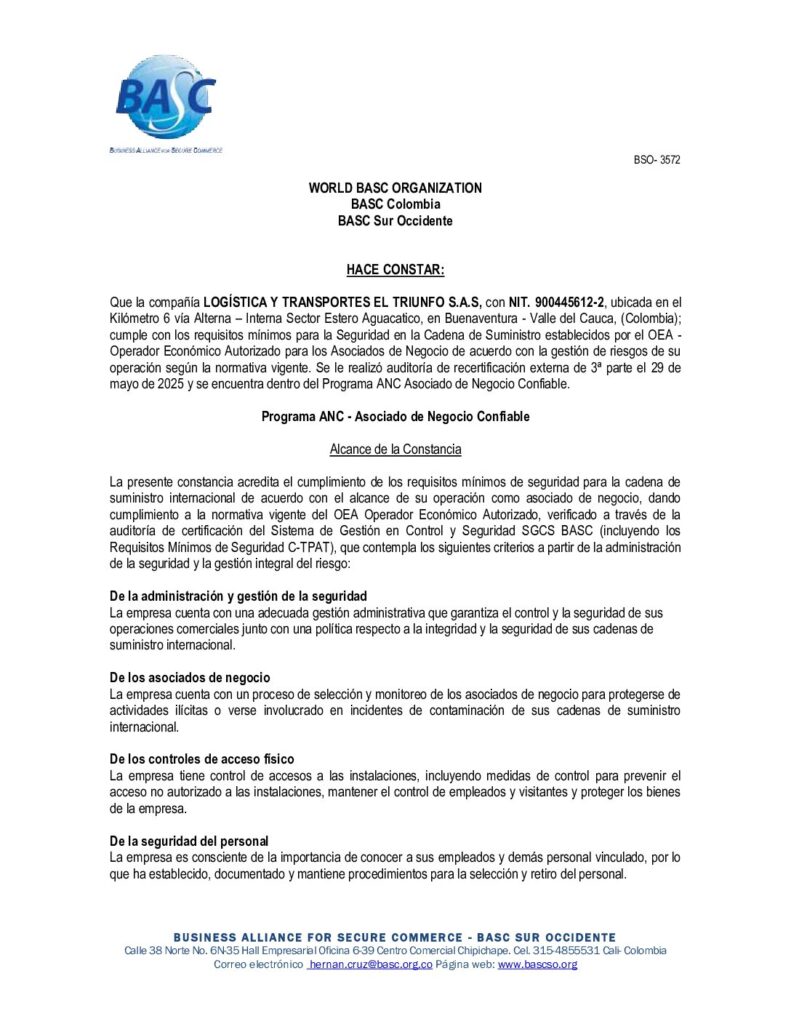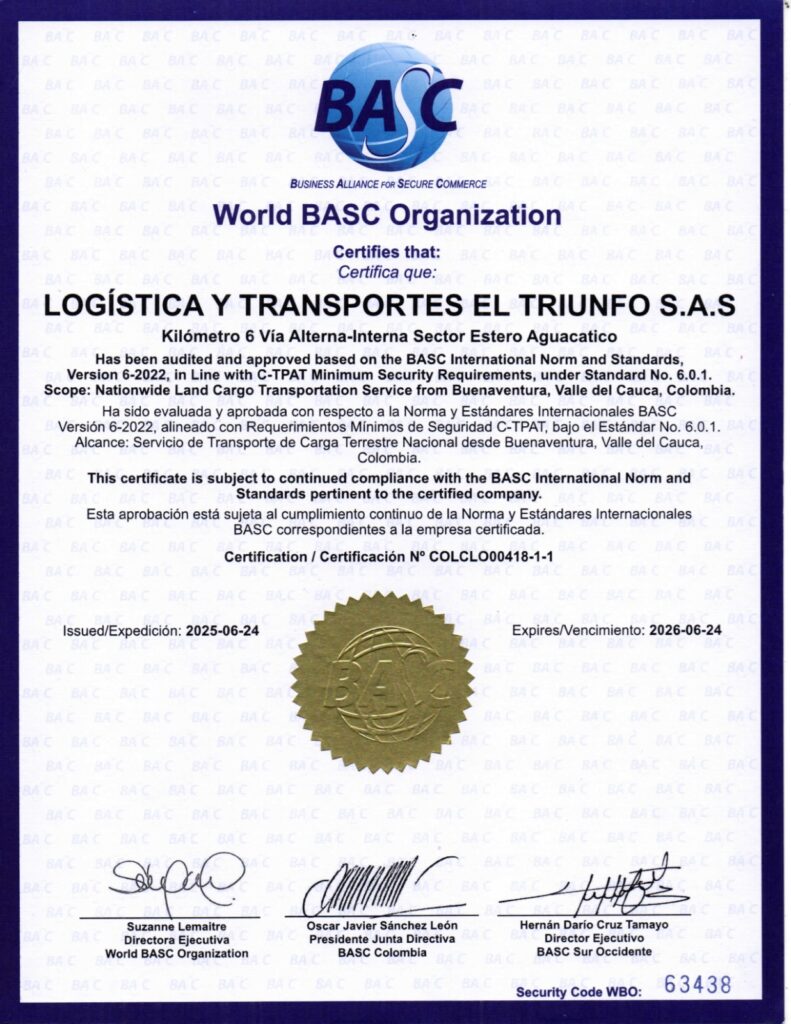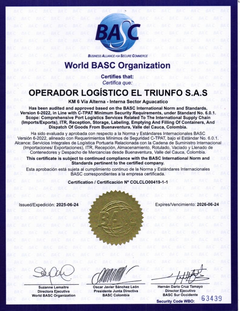 La empresa Logística y transportes el Triunfo es una organización legalmente constituida dedicada a la Operación Portuaria, Almacenamiento de Mercancía y Transporte de carga por carretera.
